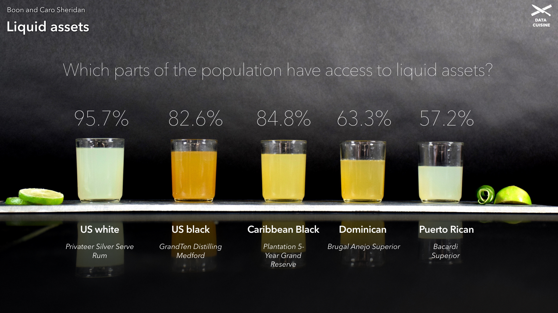 The recent ‘The Color of Wealth in Boston’ report revealed the difference in access to liquid assets in the Boston population. The research inspired Boon and Carol to produce six Daiquiri variations. The different rums used indicate the ethnic group/origin and their amount of liquid assets.