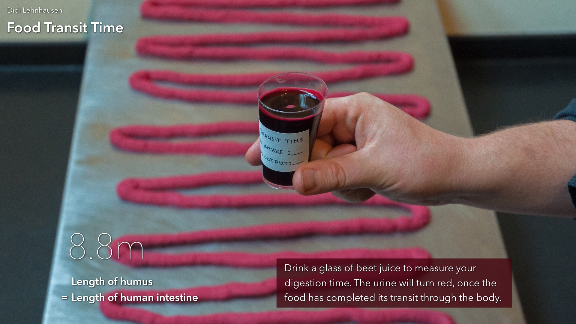The 8.8 metre line of humus represents the average length of a human intestine. Before eating the humus, each participant is provided with a plastic cup for collecting urine. The participant should write his/her name and the time of intake on the cup. When the urine turns reddish, the humus has been fully digested and the participant should note his/her personal time for digestion on the cup.
