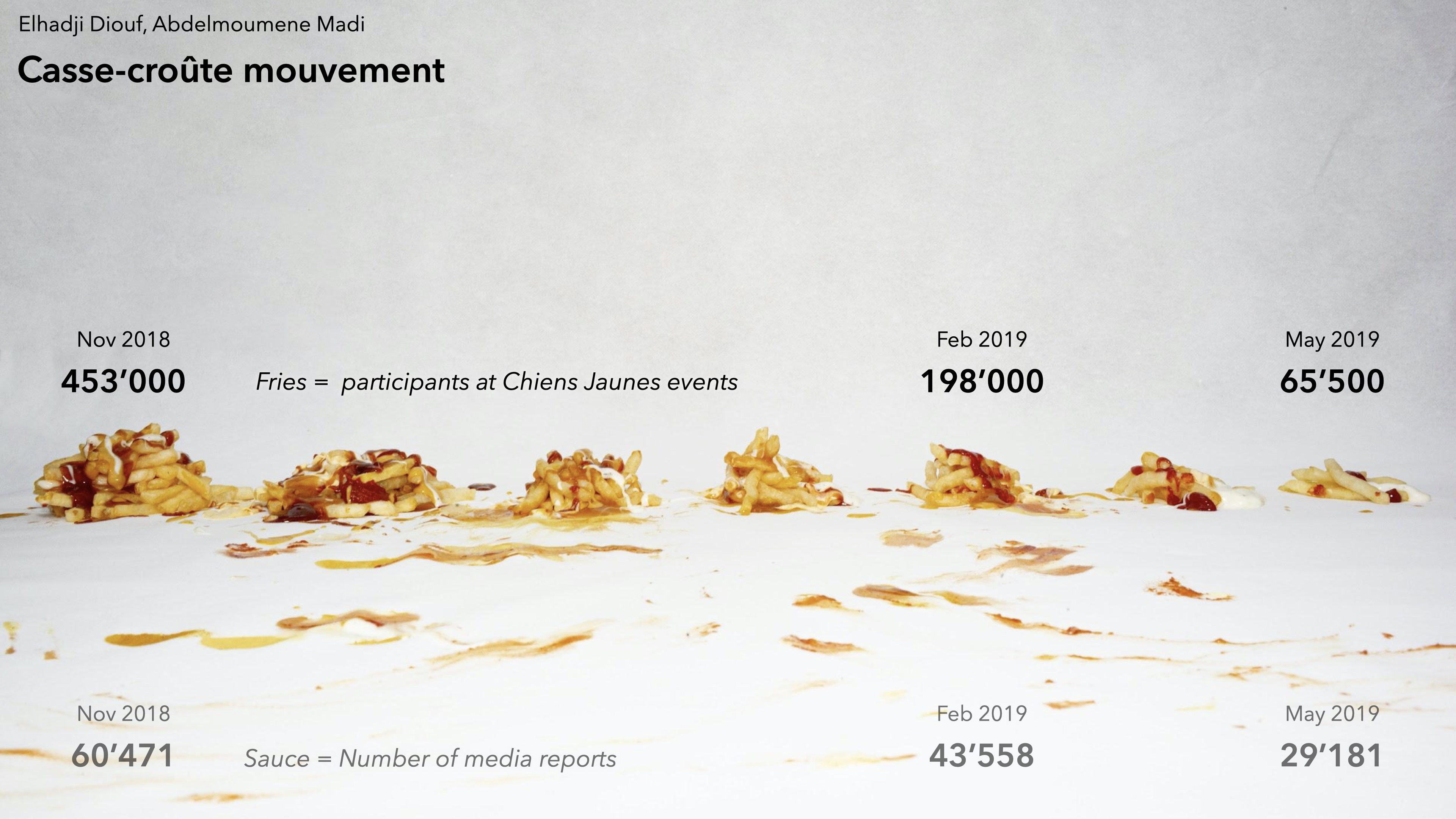 Presented in round glass containers, two mixes of vegetables and mushrooms show the increased amount of forest cover in France, comparing the years 1830 (9.5 million hectare) and 2014 (16 million hectares). The percentage of vegetables and mushrooms indicates the relation of forest area to metropolitan areas. The representation of the "1830 forest" reminds of a black-and-white photograph, while the modern one is colourful. The 2014 forest is composed of cauliflower, parsley, pumpkin seeds and parasol mushrooms on a base of crumble. In the 1830 forest cauliflower and trompettes de la mort are sitting on a carbon-coloured base.