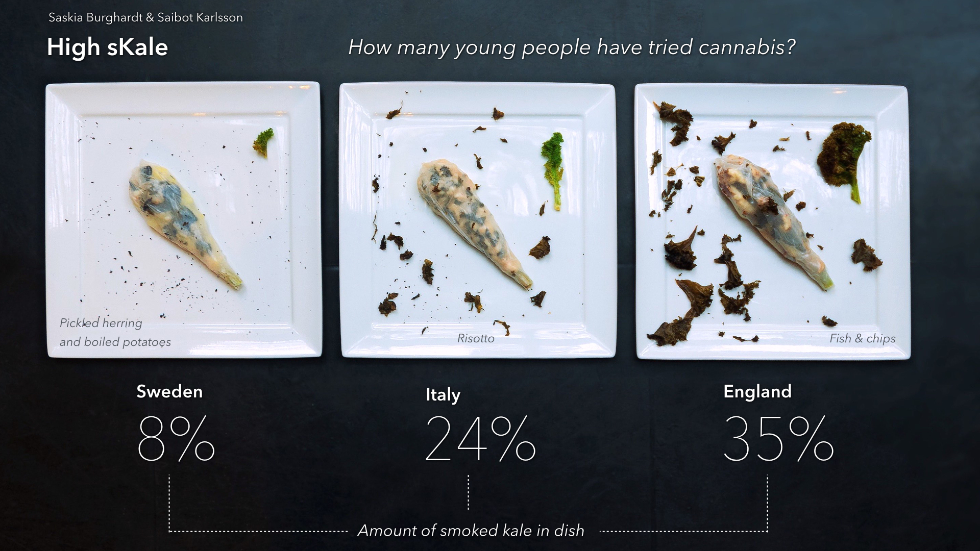Smoked kale is the key ingredient of these dishes, that are based on data about cannabis consumption by 15 to 16-year old kids in England (35% have tried cannabis), Italy (24%) and Sweden (8%). Three big joints are made with a filling representing the different countries: fish and chips, risotto, and pickled herring with boiled potatoes. To each of the fillings smoked kale is added according to the amount of pot smokers.