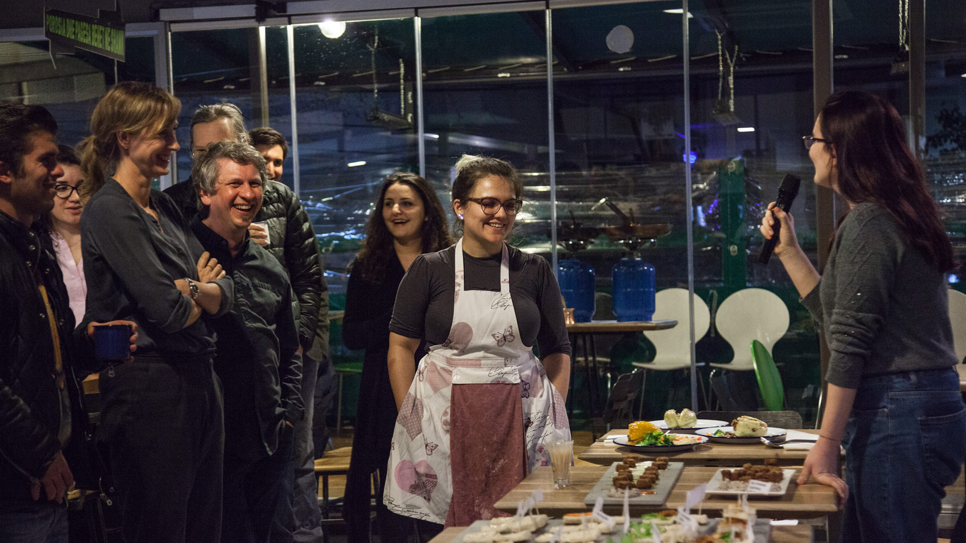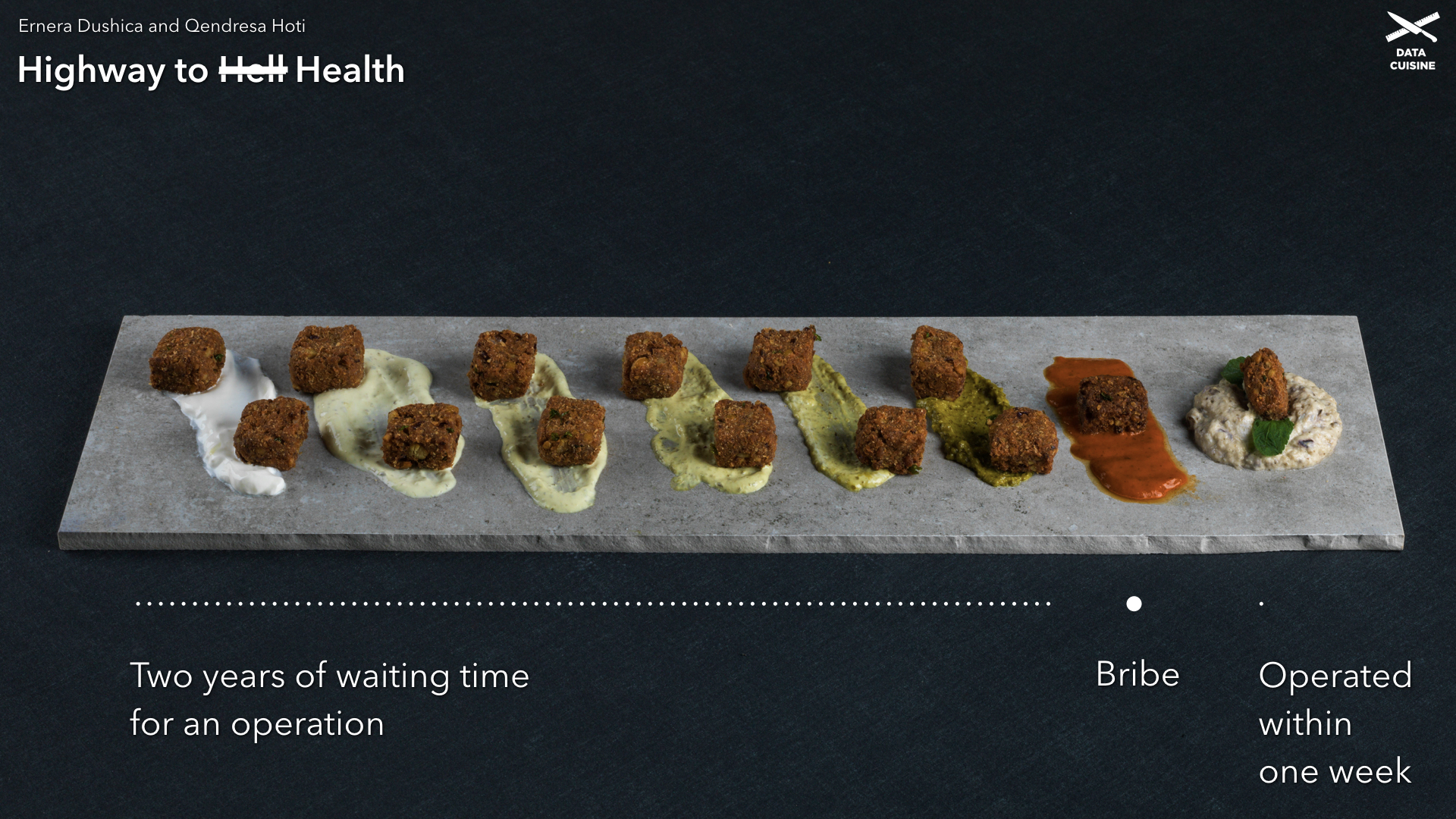 This Falafel platter tells the true story of a relative who waited for an operation for two years and was finally operated within a week after bribing the hospital staff. The long waiting time is represented with falafel nuggets along with a sauce that gradually gets darker as more pesto is added to the sour cream: While there is hope in the beginning, this hope is lost on the way. The bribe itself can be experienced as a hot chili and tomato sauce. After the bribe, when health is regained, a delicious and healthy looking baba ghanoush caters to your senses.