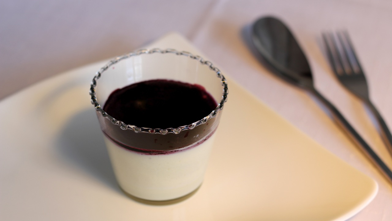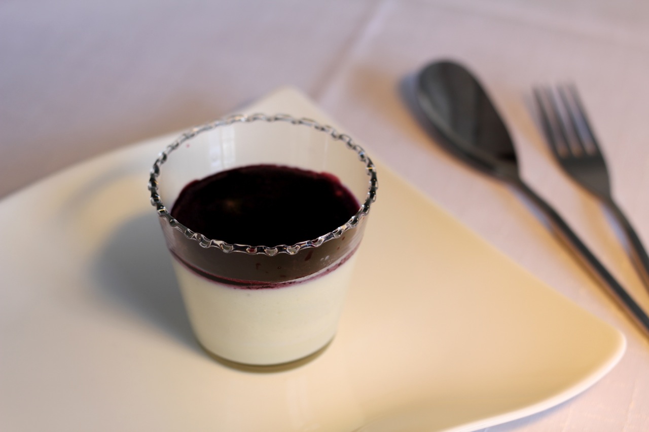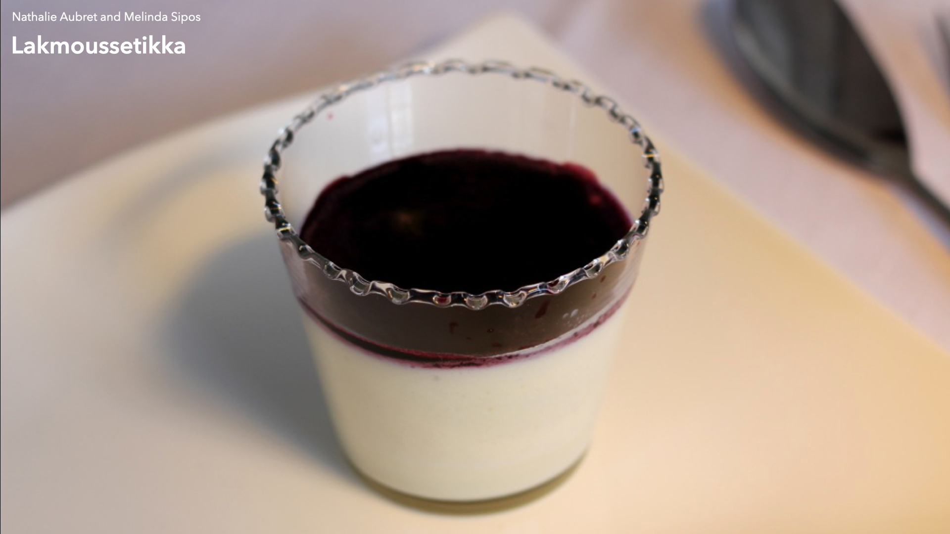 This dessert represents the amount of picked berries in comparison to to all the berries that could be picked in theory, but are left in Finnish forest. The very thin layer of blueberry on top represent the picked berries, the others are represented by the big amount of mousse on bottom.