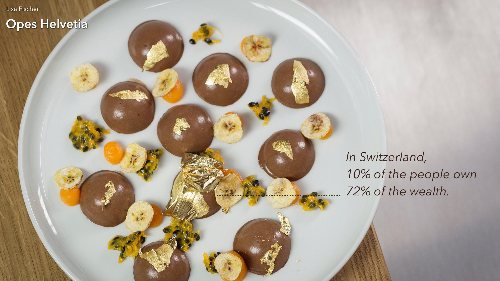 In Switzerland, 10% of the people own 72% of the wealth. Opes Helvetia is a luscious representation of wealth inequality in Switzerland, made with chocolate, banana, and edible gold leaf.